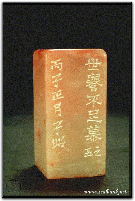 黃嘗銘.四十三歲/刻〔世譽不足慕〕正方朱白文印。邊款為【世譽不足慕。之五。丙子正月,子昭。】巴林雞血。