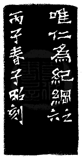 黃嘗銘.四十三歲/刻〔唯仁為紀綱〕正方粗朱文印。邊款為【唯仁為紀綱。之六。丙子春,子昭刻。】巴林雞血。
