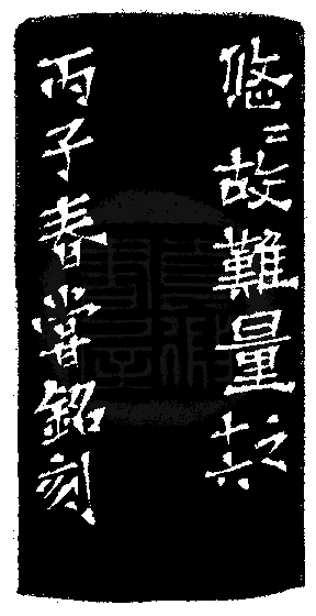 黃嘗銘.四十三歲/刻〔悠悠故難量〕正方朱文縱格印。邊款為【悠悠故難量。之十六。丙子春,嘗銘刻。】巴林雞血。