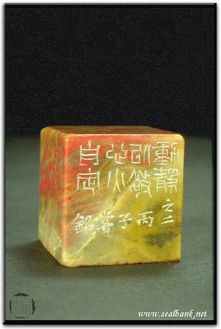 黃嘗銘.四十三歲/刻〔動靜以敬〕正方滿白文印。邊款為【動靜以敬,心火自定。之二。丙子,嘗銘。】原印今藏於石汝銘。昌化雞血。