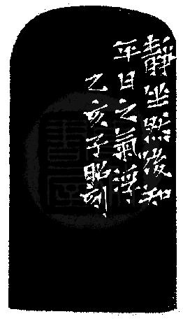 黃嘗銘.四十二歲/刻〔靜坐〕長方朱文印。邊款為【靜坐然後知平日之氣浮。乙亥,子昭刻。】原印今藏於王治國。昌化雞血。