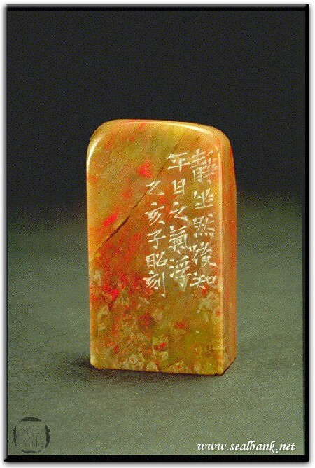 黃嘗銘.四十二歲/刻〔靜坐〕長方朱文印。邊款為【靜坐然後知平日之氣浮。乙亥,子昭刻。】原印今藏於王治國。昌化雞血。