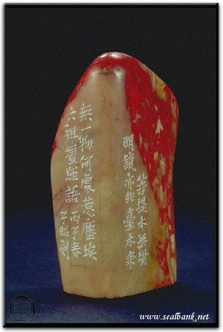 黃嘗銘.四十三歲/刻〔本來無一物〕自然形朱文印。邊款為【菩提本無樹,明鏡亦非臺,本來無一物,何處惹塵埃。六祖譚經語。丙子春,子昭刻。】原印今藏於葉世茂。昌化雞血。