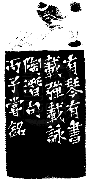黃嘗銘.四十三歲/刻〔委懷琴書〕正方朱白文印。邊款為【有琴有書,載彈載詠。陶潛句。丙子,嘗銘。】壽山雞母窩。