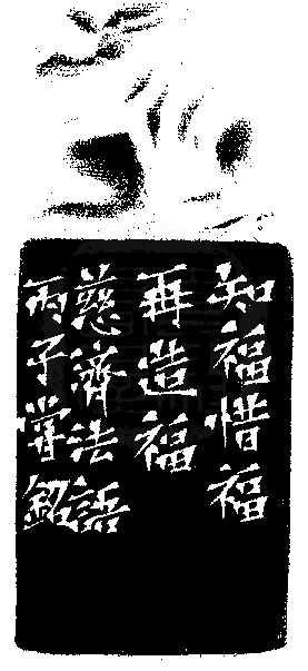 黃嘗銘.四十三歲/刻〔惜福〕長方朱文印。邊款為【知福惜福再造福。慈濟法語。丙子,嘗銘。】原印今藏於蕭俊卿。荔枝凍。