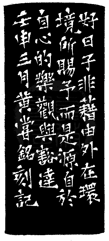 黃嘗銘.卅九歲/刻〔日日吉日〕正方朱白文印。邊款為【好日子非藉由外在環境所賜予,而是源自於自心的樂觀與豁達。壬申三月,黃嘗銘刻記。】原印今藏於柯詩安。巴林石。