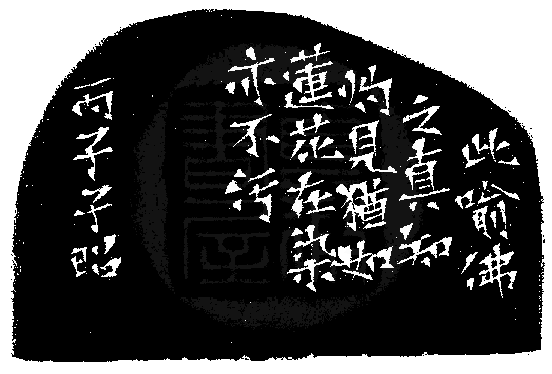 黃嘗銘.四十三歲/刻〔妙蓮華〕長方加框白文印。邊款為【比喻佛之真知灼見,猶如蓮花在染亦不污。丙子,子昭。】原印今藏於吳放。昌化雞血。