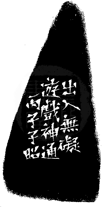 黃嘗銘.四十三歲/刻〔遊戲神通〕自然形朱文印。邊款為【出入無礙,遊戲神通。丙子,子昭。】原印今藏於徐順天。昌化雞血。