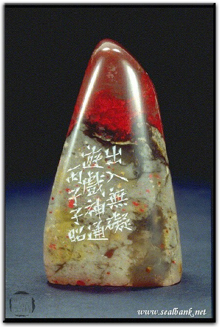 黃嘗銘.四十三歲/刻〔遊戲神通〕自然形朱文印。邊款為【出入無礙,遊戲神通。丙子,子昭。】原印今藏於徐順天。昌化雞血。