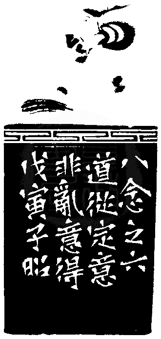 黃嘗銘.四十五歲/刻〔定意〕長方滿白文印。邊款為【八念之六,道從定意,非亂意得。戊寅,子昭。】江西石。