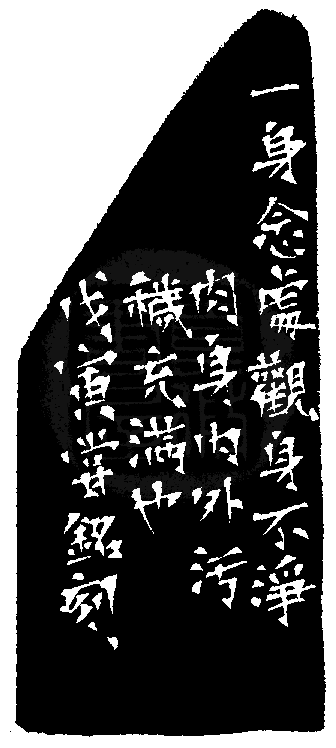 黃嘗銘.四十五歲/刻〔觀身不淨〕正方朱文印。邊款為【一身念處,觀身不淨,肉身內外,污穢充滿也。戊寅,嘗銘刻。】昌化雞血。