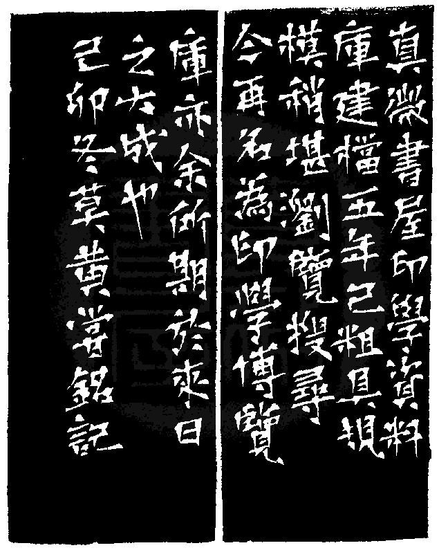 黃嘗銘.四十六歲/刻自用印〔真微印博〕正方白文印。邊款為【真微書屋印學資料庫建檔五年,已粗具規模,稍堪瀏覽搜尋。今再名為印學博覽庫,亦余所期於來日之大成也。己卯冬莫,黃嘗銘記。】江西石。