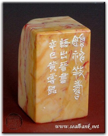 黃嘗銘.四十八歲/刻〔頤神養壽〕正方朱文印。邊款為【頤神養壽。語出晉書。辛巳,黃嘗銘。】巴林雞血石。