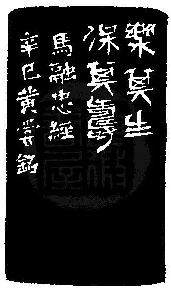 黃嘗銘.四十八歲/刻〔樂其生保其壽〕正方白文印。邊款為【樂其生保其壽。馬融忠經。辛巳,黃嘗銘。】青田凍。