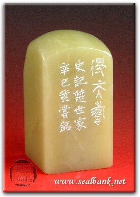 黃嘗銘.四十八歲/刻〔得天壽〕正方白文印。邊款為【得天壽。史記楚世家。辛巳,黃嘗銘。】青田凍。