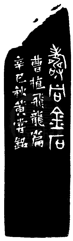 黃嘗銘.四十八歲/刻〔壽同金石〕正方白文印。邊款為【壽同金石。曹植飛龍篇。辛巳秋,黃嘗銘。】壽山巧色高山。