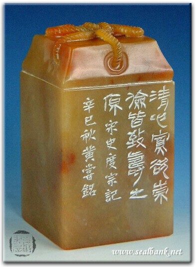 黃嘗銘.四十八歲/刻〔清心寡欲崇儉皆致壽之原〕正方白文印。邊款為【清心、寡欲、崇儉,皆致壽之原。宋史度宗記。辛巳秋,黃嘗銘。】壽山都靈坑。