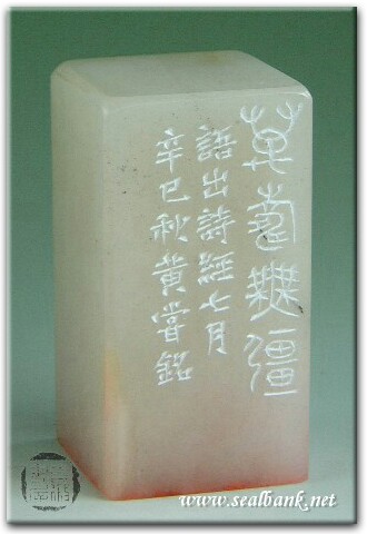 黃嘗銘.四十八歲/刻〔萬壽無疆〕正方白文界格印。邊款為【萬壽無疆。語出《詩經.七月》。辛巳秋,黃嘗銘。】荔枝凍。