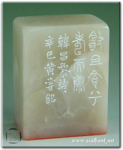 黃嘗銘.四十八歲/刻〔飲且食兮壽而康〕長方朱文印。邊款為【飲且食兮壽而康。韓昌黎詩。辛巳,黃嘗銘。】荔枝凍。