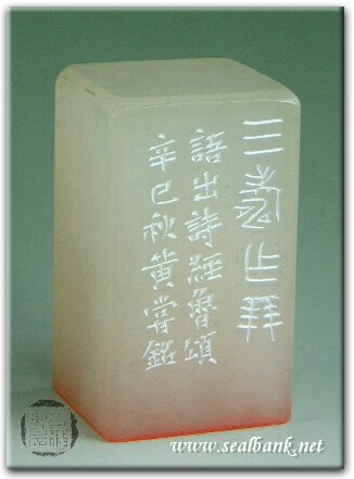 黃嘗銘.四十八歲/刻〔三壽作朋〕正方加框白文印。邊款為【三壽作朋。語出詩經魯頌。辛巳秋,黃嘗銘。】荔枝凍。