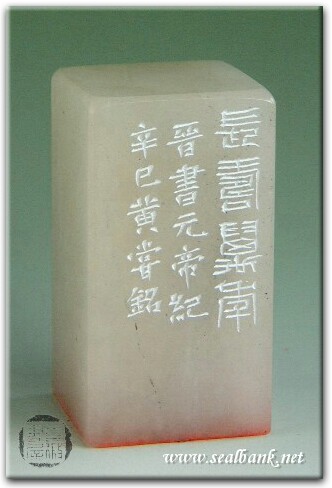 黃嘗銘.四十八歲/刻〔長壽萬年〕正方朱文印。邊款為【長壽萬年。晉書元帝紀。辛巳,黃嘗銘。】荔枝凍。