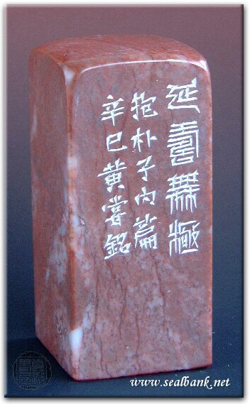 黃嘗銘.四十八歲/刻〔延壽無極〕正方朱文界格印。邊款為【延壽無極。抱朴子內篇。辛巳,黃嘗銘。】高麗石。