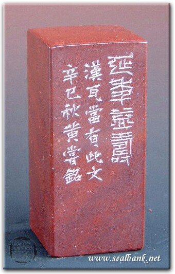 黃嘗銘.四十八歲/刻〔延年益壽〕正方朱文印。邊款為【延年益壽。漢瓦當有此文。辛巳秋,黃嘗銘。】蕭山石。