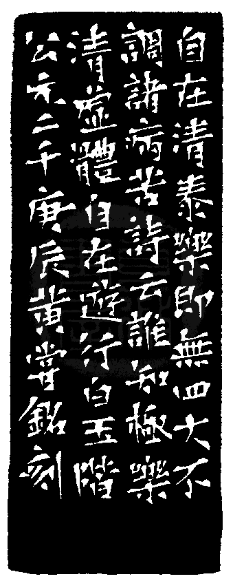 黃嘗銘.四十七歲/刻〔自在清泰〕正方白文印。邊款為【自在清泰樂,即無四大不調諸病苦。詩云:誰知極樂清虛體,自在遊行白玉階。公元二千庚辰,黃嘗銘刻。】江西硯水凍。
