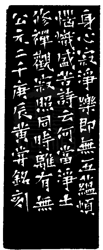 黃嘗銘.四十七歲/刻〔身心寂淨〕正方細朱文印。邊款為【身心寂淨樂,即無五蘊煩惱熾盛苦。詩云:何當淨土修禪觀,寂照同時離有無。公元二千庚辰,黃嘗銘刻。】江西硯水凍。