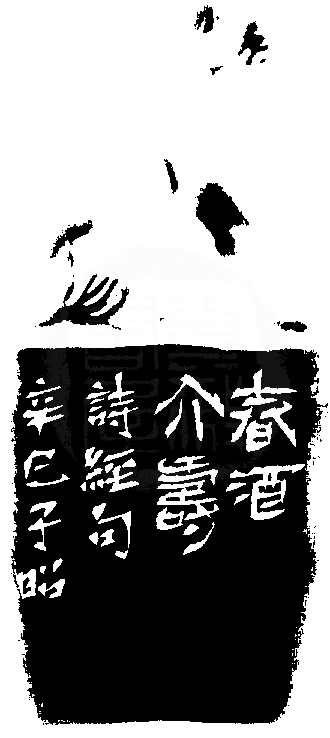 黃嘗銘.四十八歲/刻〔春酒介壽〕長橢圓朱文借邊印。邊款為【春酒介壽。詩經句。辛巳,子昭。】原印今藏於葉世茂。芙蓉石。