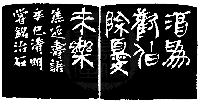 黃嘗銘.四十八歲/刻〔酒為歡伯〕正方朱文印。邊款為【酒為歡伯,除憂來樂。焦延壽語。辛巳清明,嘗銘治石。】巴林凍。