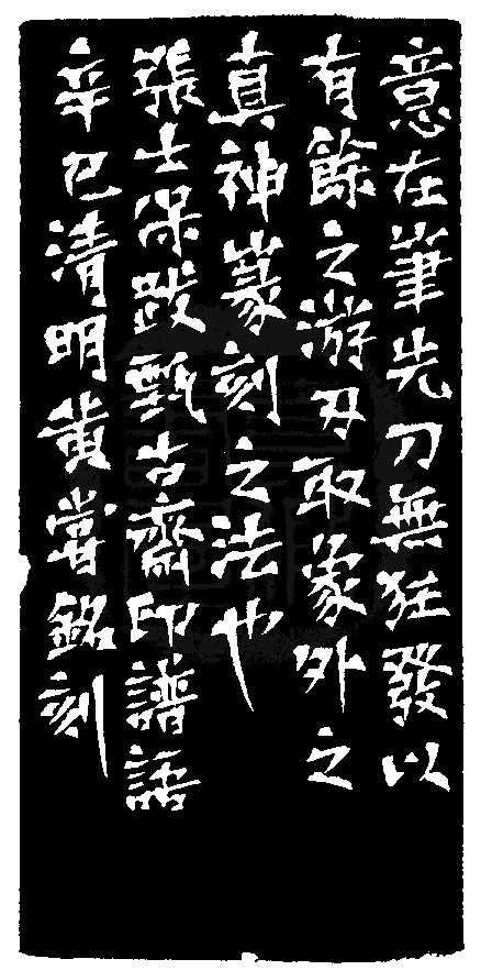 黃嘗銘.四十八歲/刻〔象外真神〕正方白文印。邊款為【意在筆先,刀無狂發,以有餘之游刃,取象外之真神,篆刻之法也。張士保跋甄古齋印譜語。辛巳清明,黃嘗銘刻。】巴林凍。