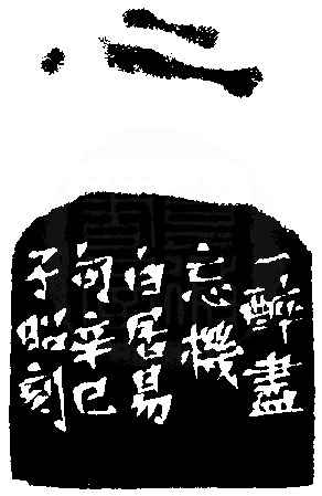 黃嘗銘.四十八歲/刻〔一醉忘機〕長方白文印。邊款為【一醉盡忘機。白居易句。辛巳,子昭刻。】原印今藏於蕭俊卿。芙蓉石。