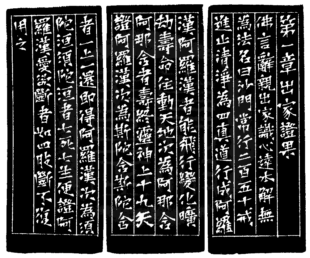 | | 印文:出家證果 | | 約 橫 2.6 X 豎 2.6 公分 邊款圖 | | 黃嘗銘.四十五歲/刻〔出家證果〕正方白文印。邊款為【第一章出家證果。佛言:辭親出家,識心達本,解無為法,名曰沙門。常行二百五十戒,進止清淨,為四真道行,成阿羅漢。阿羅漢者,能飛行變化,曠劫壽命,住動天地。次為阿那含。阿那含者,壽終靈神上十九天。證阿羅漢。次為斯陀含。斯陀含者,一上一還,即得阿羅漢。次為須陀洹。須陀洹者,七死七生,便證阿羅漢。愛欲斷者,如四肢斷,不復用之。】 1998 年刻 |