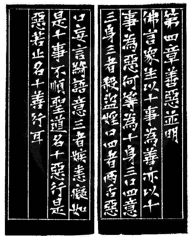 黃嘗銘.四十五歲/刻〔善惡並明〕正方朱文無邊印。邊款為【第四章善惡並明。佛言:眾生以十事為善,亦以十事為惡。何等為十?身三、口四、意三。身三者,殺盜婬。口四者,兩舌、惡口、妄言、綺語。意三者,嫉恚癡。如是十事,不順聖道,名十惡行。是惡若止,名十善行耳。】