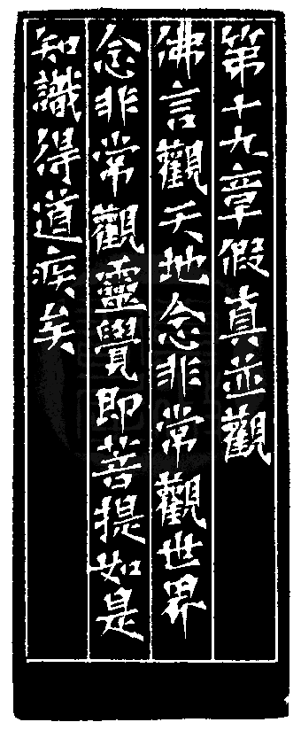 黃嘗銘.四十五歲/刻〔假真並觀〕正方白文印。邊款為【第十九章假真並觀。佛言:觀天地,念非常。觀世界,念非常。觀靈覺,即菩提。如是知識,得道疾矣!】