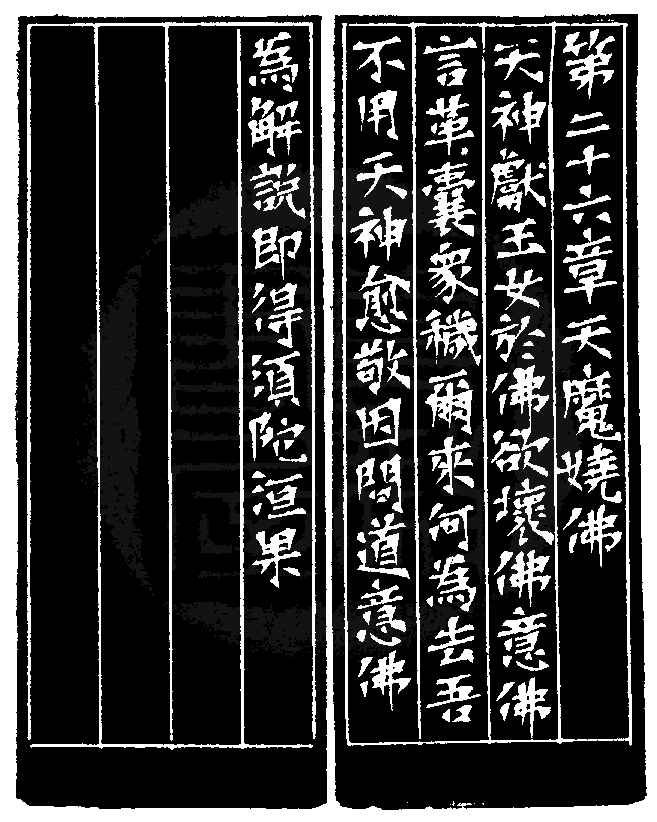 黃嘗銘.四十五歲/刻〔天魔嬈佛〕正方白文印。邊款為【第二十六章天魔嬈佛。天神獻玉女於佛,欲壞佛意。佛言:革囊眾穢,爾來何為?去!吾不用。天神愈敬,因問道意。佛為解說,即得須陀洹果。】