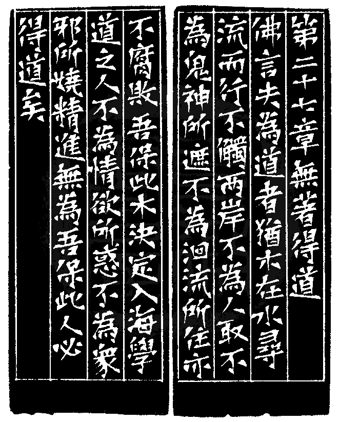 黃嘗銘.四十五歲/刻〔無著得道〕正方朱文縱格印。邊款為【第二十七章無著得道。佛言:夫為道者,猶木在水,尋流而行。不觸兩岸,不為人取,不為鬼神所遮,不為洄流所住,亦不腐敗,吾保此木決定入海。學道之人,不為情欲所惑,不為眾邪所嬈,精進無為,吾保此人必得道矣。】