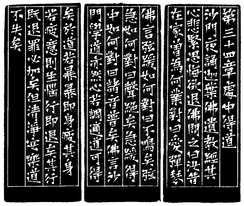 | | 印文:處中得道 | | 約 橫 2.6 X 豎 2.6 公分 印面圖 | | 黃嘗銘.四十五歲/刻〔處中得道〕正方朱文印。邊款為【第三十四章處中得道。沙門夜誦迦葉佛遺教經,其聲悲緊,思悔欲退。佛問之曰:汝昔在家,曾為何業?對曰:愛彈琴。佛言:弦緩如何?對曰:不鳴矣!弦急如何?對曰:聲絕矣!急緩得中如何?對曰:諸音普矣!佛言:沙門學道亦然,心若調適,道可得矣。於道若暴,暴即身疲。其身若疲,意即生惱。意若生惱,行即退矣。其行既退,罪必加矣。但清淨安樂,道不失矣。】 1998 年刻 |