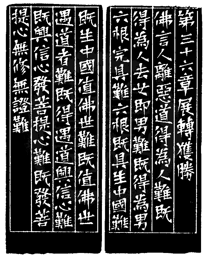 黃嘗銘.四十五歲/刻〔展轉獲勝〕正方粗朱文印。邊款為【第三十六章展轉獲勝。佛言:人離惡道,得為人難。既得為人,去女即男難。既得為男,六根完具難。六根既具,生中國難。既生中國,值佛世難。既值佛世,遇道者難。既得遇道,興信心難。既興信心,發菩提心難。既發菩提心,無修無證難。】
