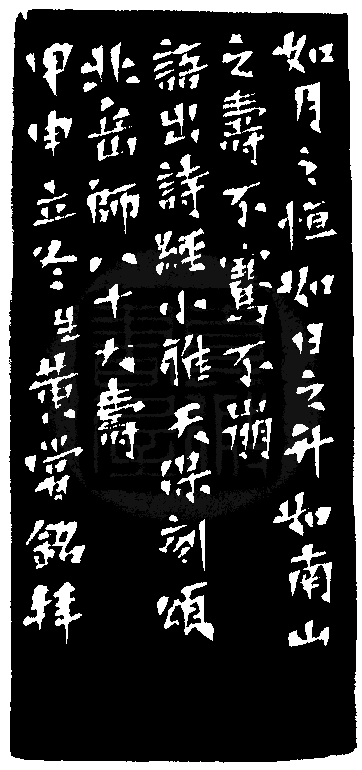 黃嘗銘.五十一歲/刻〔月恆日升南山壽〕正方白文印。邊款為【如月之恆,如日之升,如南山之壽,不騫不崩。語出詩經小雅天保,刻頌北岳師八十大壽,甲申立冬,生黃嘗銘拜。】原印今藏於王北岳。江西石。平頂。