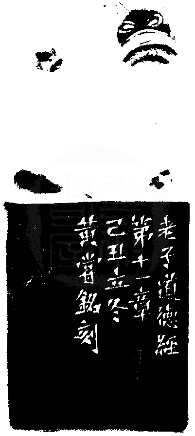 黃嘗銘.五十六歲/刻〔有之以為利無之以為用〕正方朱文印。邊款為【老子道德經第十一章,己丑立冬,黃嘗銘刻。】芙蓉石。