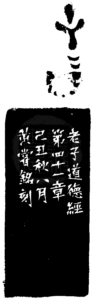 黃嘗銘.五十六歲/刻〔大象無形〕正方朱文印。邊款為【老子道德經第四十一章,己丑秋八月,黃嘗銘刻。】芙蓉石。