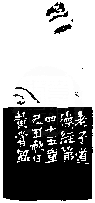 黃嘗銘.五十六歲/刻〔清靜為天下正〕正方白文印。邊款為【老子道德經第四十五章,己丑秋日,黃嘗銘。】芙蓉石。