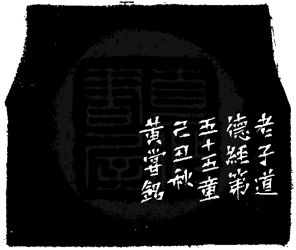 黃嘗銘.五十六歲/刻〔含德之厚比於赤子〕長方朱文印。邊款為【老子道德經第五十五章,己丑秋,黃嘗銘。】芙蓉石。