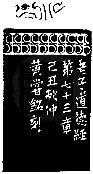 黃嘗銘.五十六歲/刻〔天網恢恢疏而不失〕正方朱文印。邊款為【老子道德經第七十三章,己丑秋仲,黃嘗銘刻。】芙蓉石。