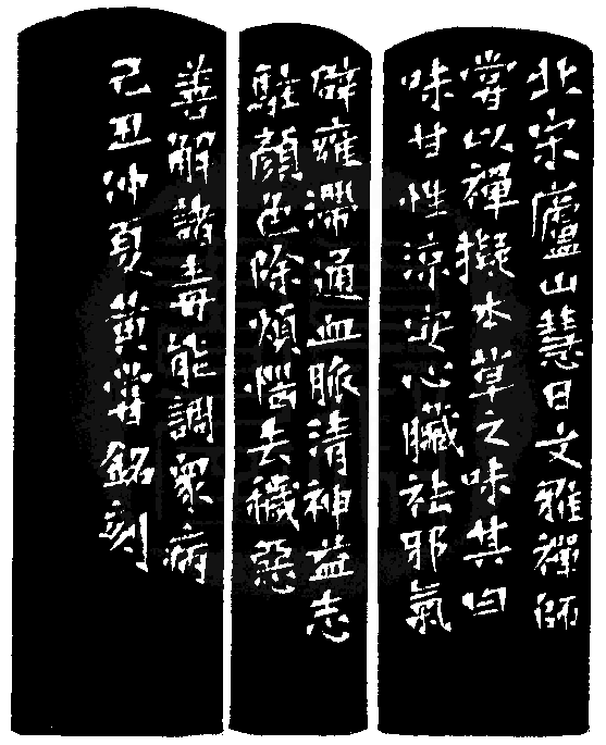黃嘗銘.五十六歲/刻〔禪〕長方白文印。邊款為【北宋廬山慧日文雅禪師嘗以禪擬本草之味,其曰:味甘,性涼,安心臟,祛邪氣,辟雍滯,通血脈,清神益志,駐顏色,除煩惱,去穢惡,善解諸毒,能調眾病。己丑仲夏,黃嘗銘刻。】昌化雞血石。