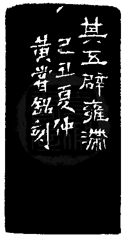 黃嘗銘.五十六歲/刻〔辟雍滯〕正方朱文印。邊款為【其五辟雍滯。己丑夏仲,黃嘗銘刻。】昌化雞血石。