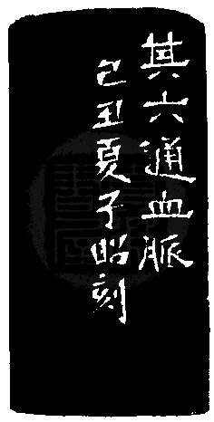 黃嘗銘.五十六歲/刻〔通血脈〕正方細白文印。邊款為【其六通血脈。己丑夏,子昭刻。】昌化雞血石。