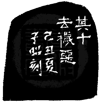 黃嘗銘.五十六歲/刻〔去穢惡〕長方白文印。邊款為【其十去穢惡。己丑夏,子昭刻。】昌化雞血石。